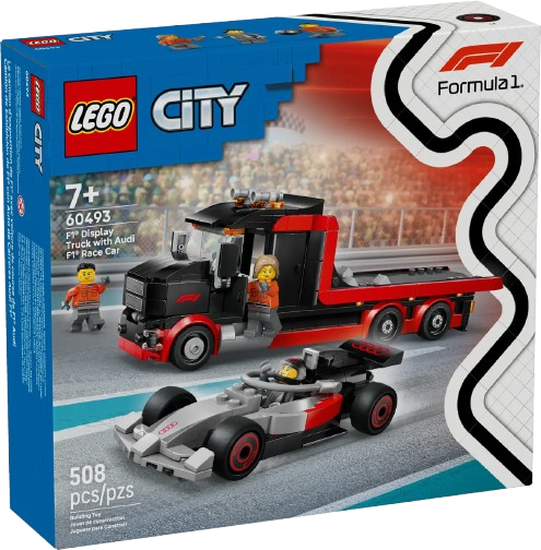 ¡Los aficionados al automovilismo mayores de 7 años podrán disfrutar de todas sus emociones con el set LEGO® City Camión de Exposición de F1® con Coche de Carreras Audi F1® (60493)!